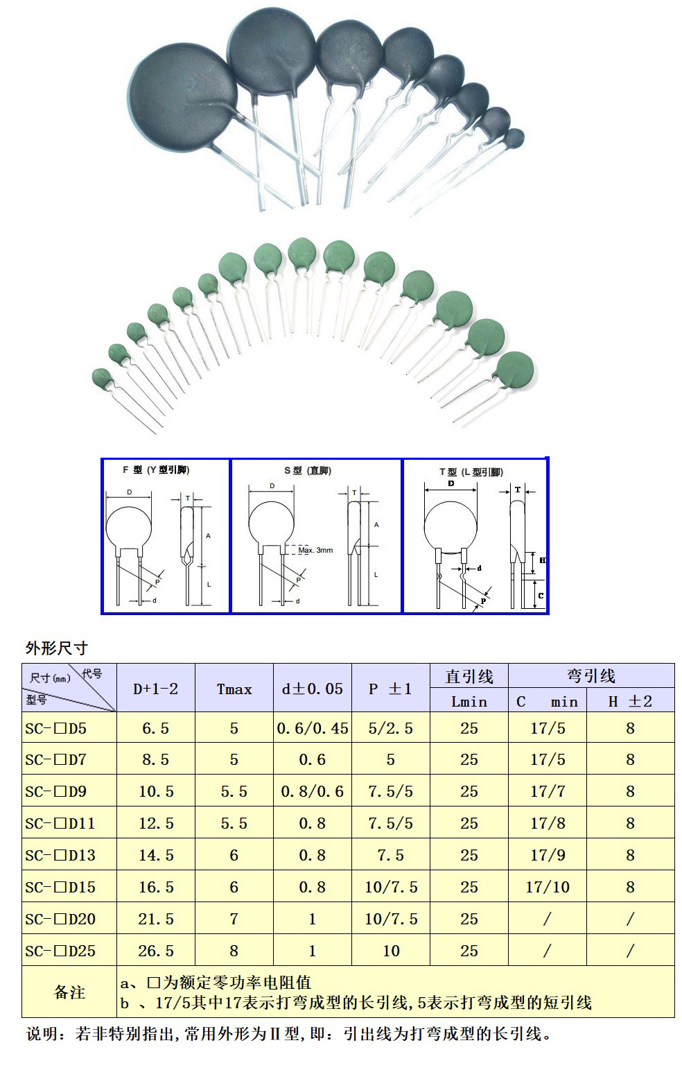 注意:本公司生产的NTC热敏电阻有铜包钢镀锡CP引线,和铜引线,其中相同规格CP线的最大稳态电流约为铜线的85~90%,包封材料有酚醛树脂和硅树脂,其中相同规格的酚醛树脂工作温度要比硅树脂的小20摄氏度左右。